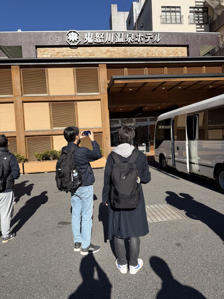 初日の朝は事務所に集合し、バスに乗ってみんなで鬼怒川へ出発!